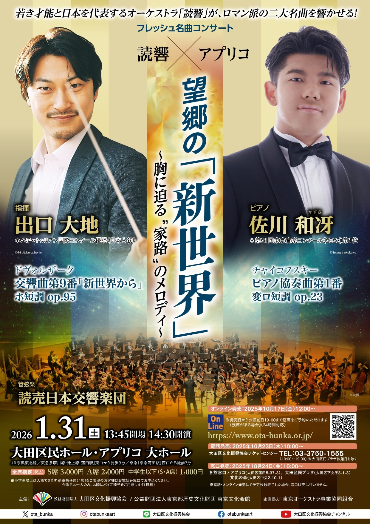 来年1月31日(土)14時30分から大田区民ホール・アプリコにて「フレッシュ名曲コンサート/読響×アプリコ 望郷の「新世界」(主催:公益財団法人 大田区文化振興協会、公益財団法人 東京都歴史文化財団、東京文化会館)を開催します。