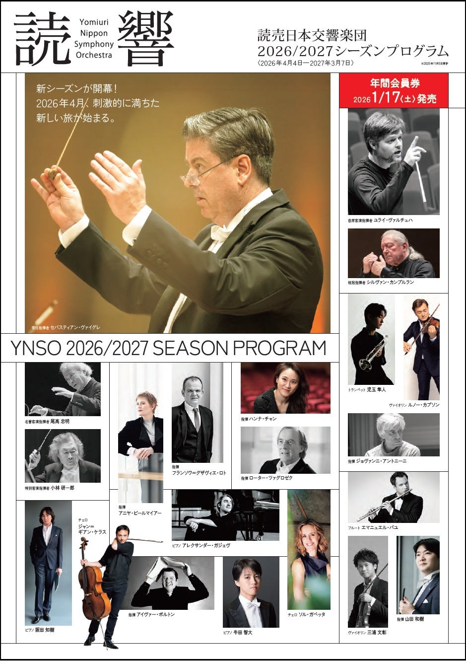 2026年度(2026年4月~2027年3月)シーズンの《定期演奏会》《名曲》《土曜マチネー》《日曜マチネー》《横浜マチネー》の各シリーズの年間会員券(連続券)を、明日1月17日(土)10時から発売します。